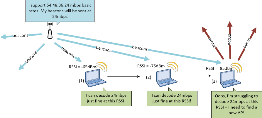 For instance, many APs will, by default, support connection rates all the way from very high-end speeds (e.g. perhaps 866Mbps for an 802.11ac AP) down to very low legacy speeds (e.g. 6Mbps on 5GHz, or 1Mbps on 2.4GHz). If we over-ride the support for the lower rates so that they are not available, a client simply cannot “hang on” to an AP over such a large area. Note that support for the lower rates is often enabled by default on Wi-Fi infrastructure gear and need to be explicitly disabled.